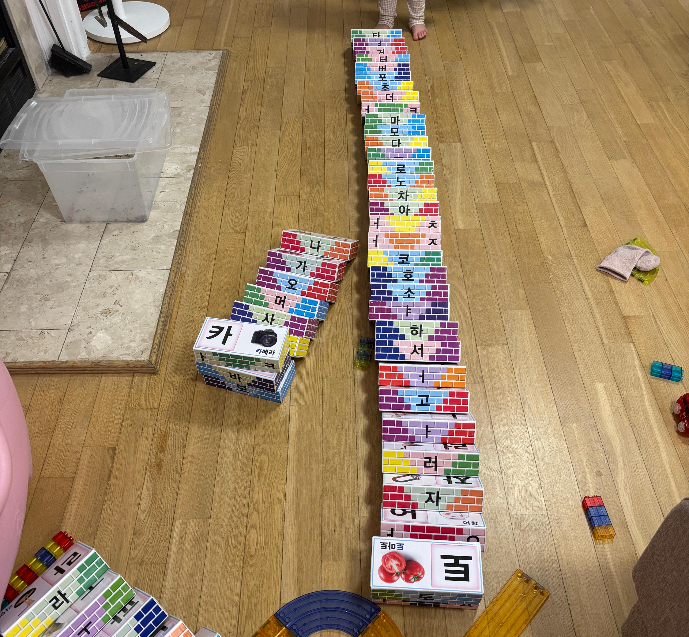 한글 벽돌, 색연필, 퍼즐 등 눈에 보이는 건 죄다 줄 세우기를 해놓았다.
