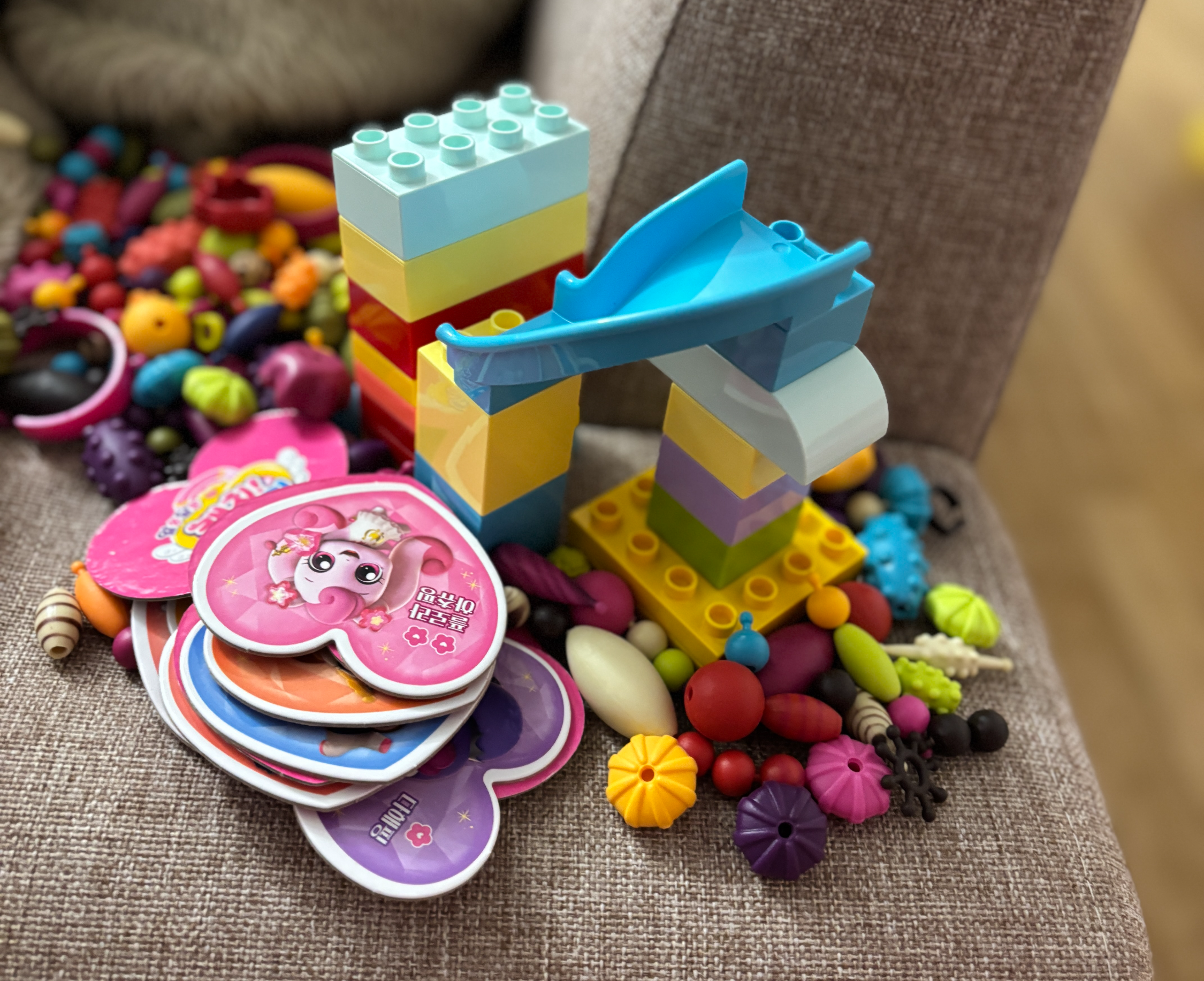 아이는 레고와 팔찌 만들기 장난감, 그림 맞추기 퍼즐을 가지고 와서 이렇게 쌓아 놓았다.