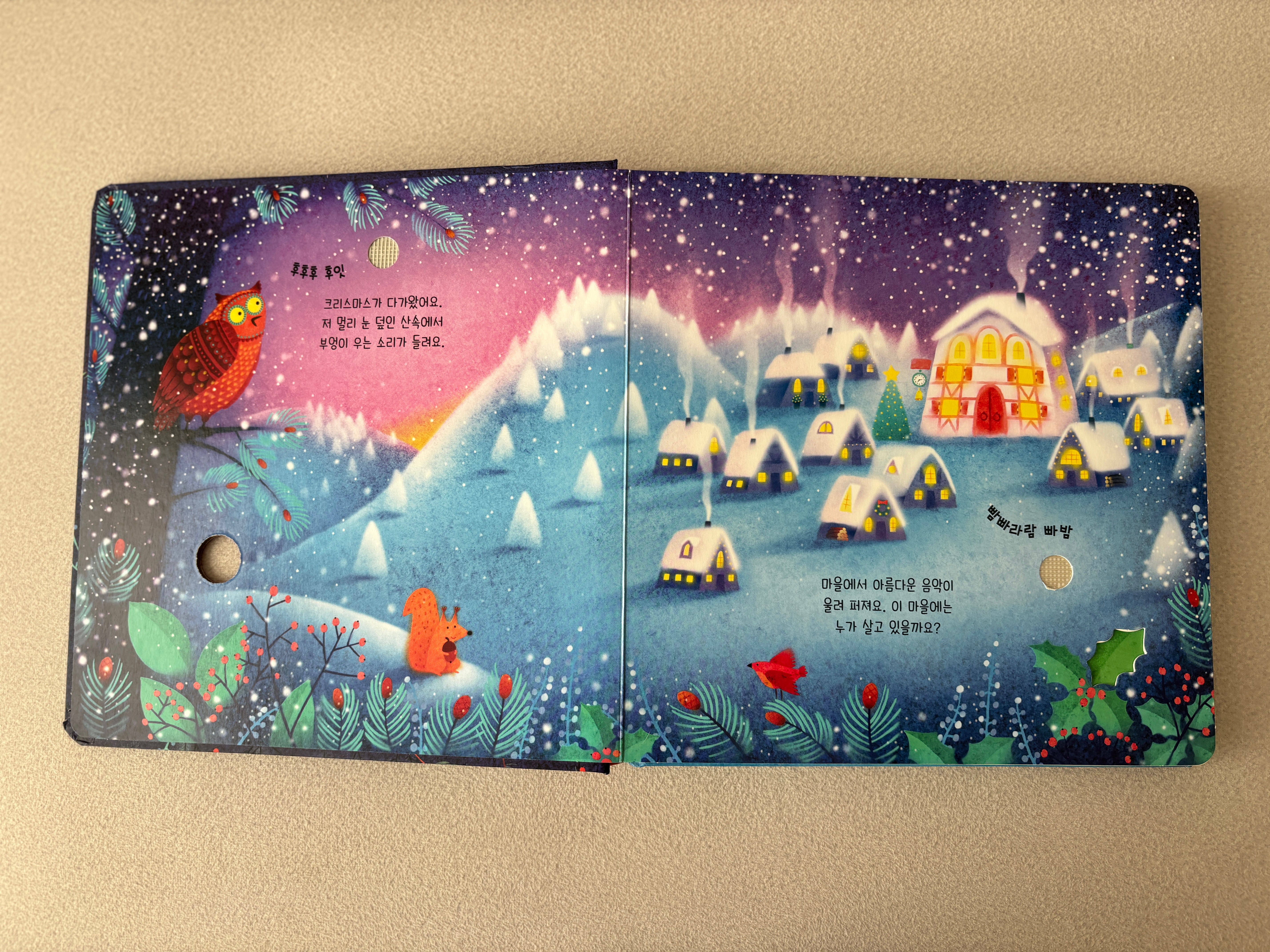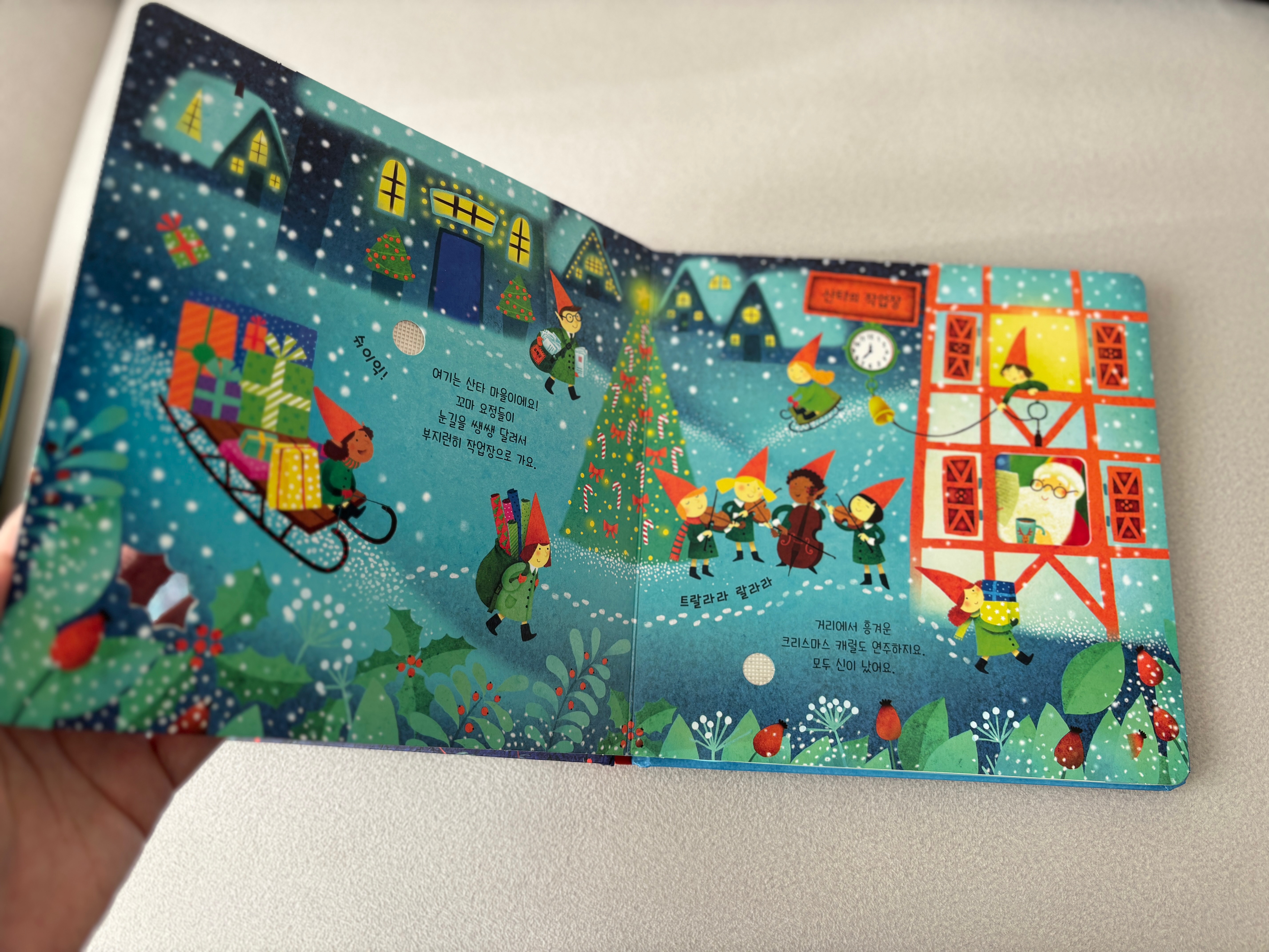 중간중간 구멍이 뚫려 있어 아이가 만져보는 재미가 있게 만들어져 있는데, 이 산타 책은 그런 구멍이 별로 없다.