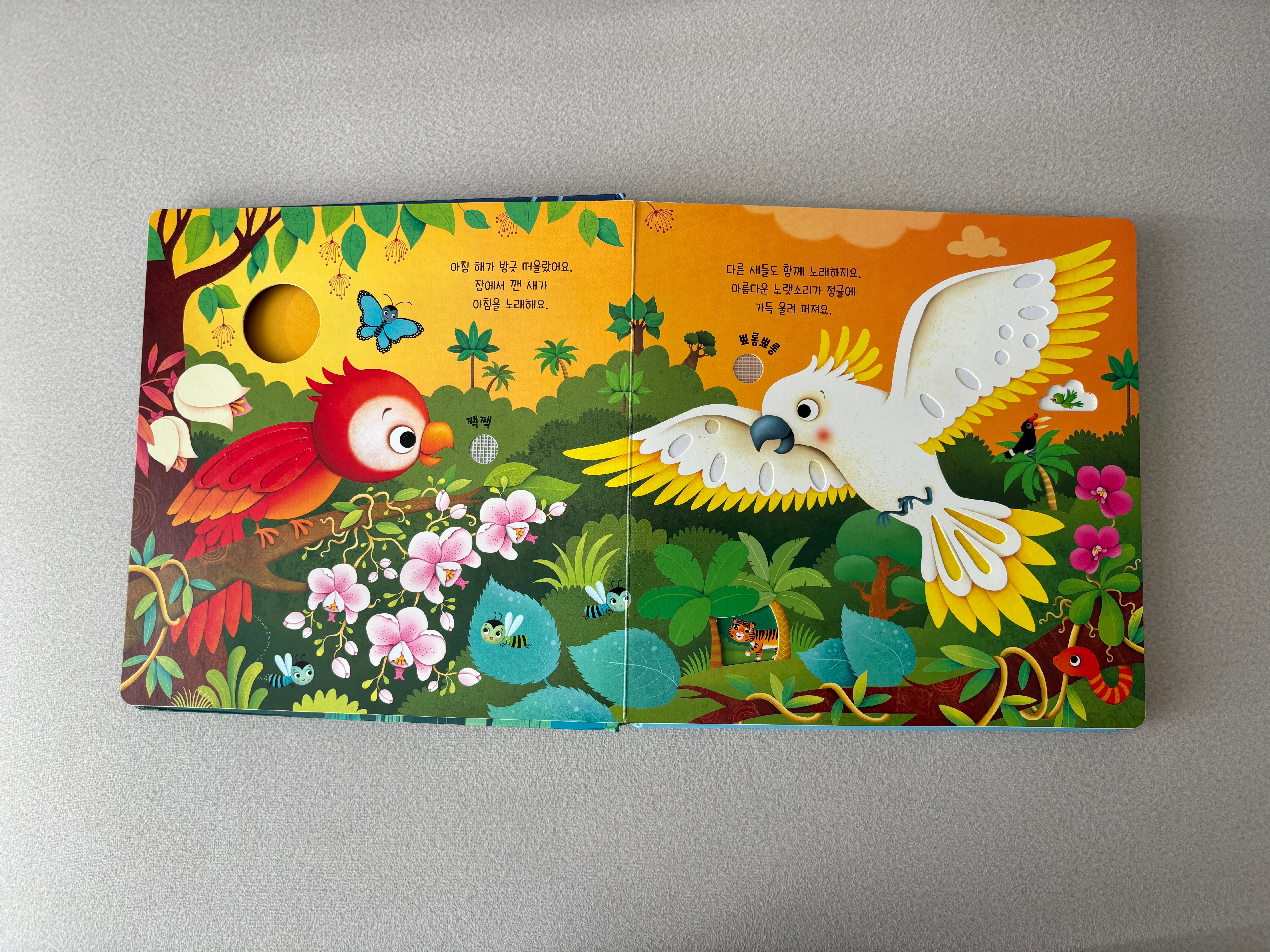 유교전 사운드북은 동물의 질감을 투박하게나마 묘사해놓은 책이어서 원숭이와 호랑이는 털, 개구리는 반질한 종이... 이런식으로 감촉을 느낄 수 있어 아기가 하루종일 그 부분을 만지며 소리를 누르는데, 어스본은 그런 질감이 결합된 책은 아니다.